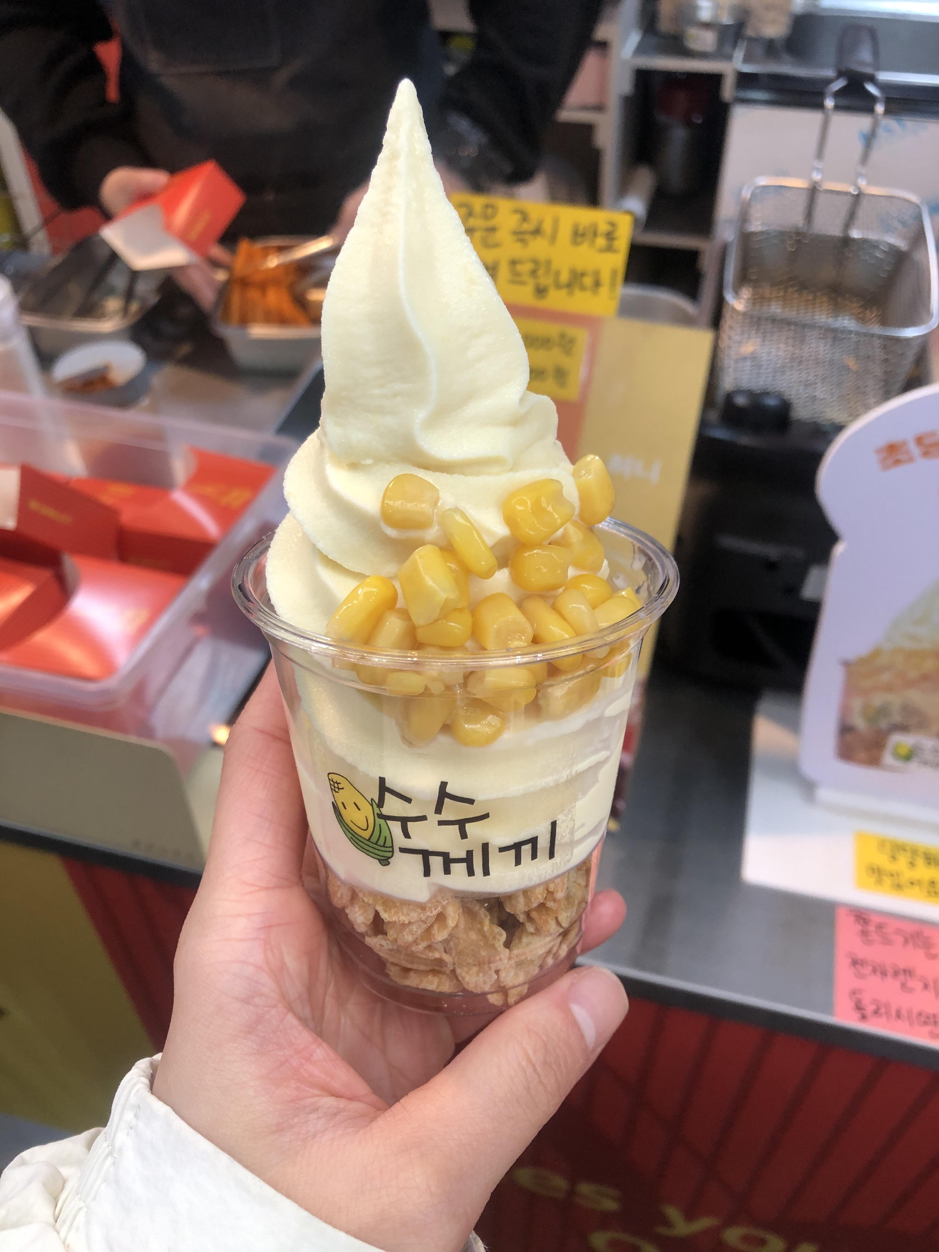 옥수수아이스크림 그위에는 캔 옥수수가 토핑 되어서 나와요
